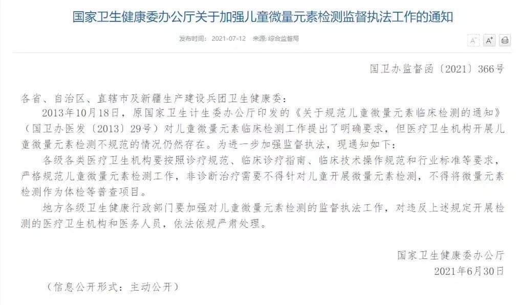 其实,我国早在2013年就印发了《关于规范儿童微量元素临床检测的通知》,明确指出“不宜将微量元素检测作为体检等普查项目,尤其是对6个月以下婴儿”,但医疗卫生机构开展儿童微量元素检测不规范的情况仍然存在。