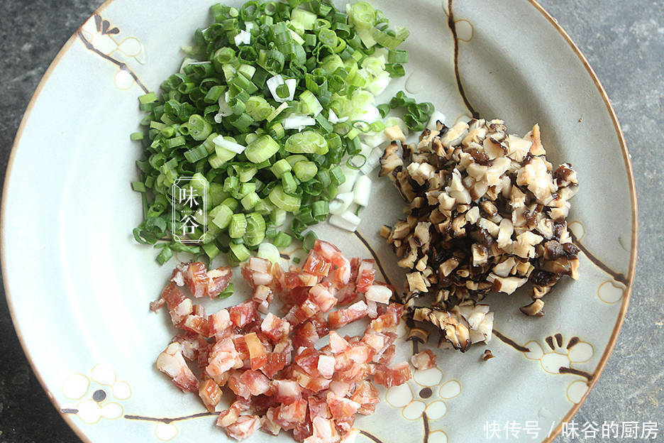 【做法】:1、香菇用水泡发,然后切碎,腊肠和香葱也切碎待用,尽量切小粒一点;
