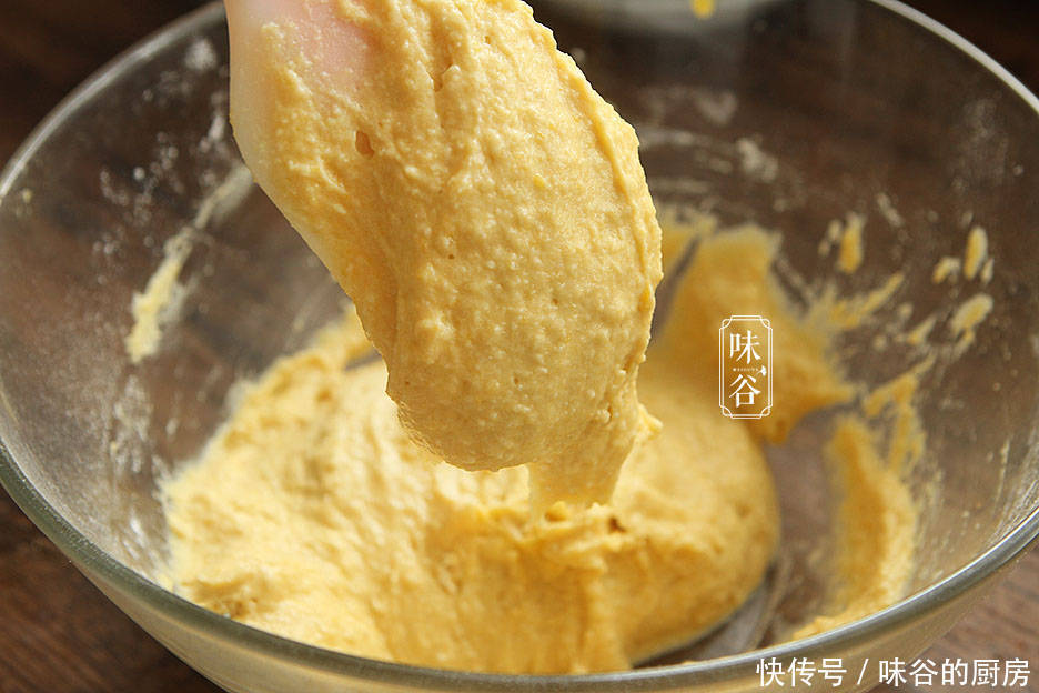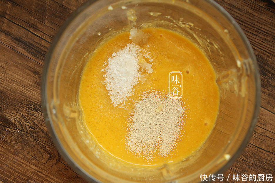 2、打好的南瓜小米糊冷却在37度以下,再放入酵母、泡打粉和白糖搅拌均匀;