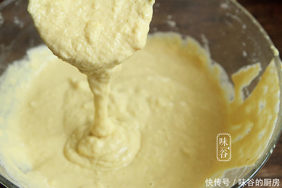 2、玉米汁加入鸡蛋、白糖和面粉,要搅拌成浓稠面糊,要注意干稀程度 ,太稀了的话小饼做不成形。