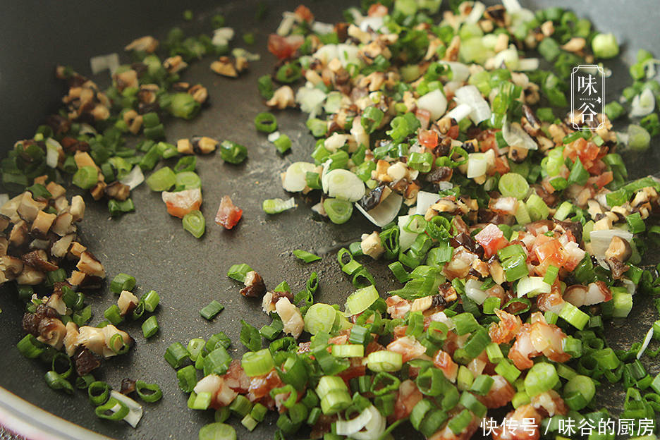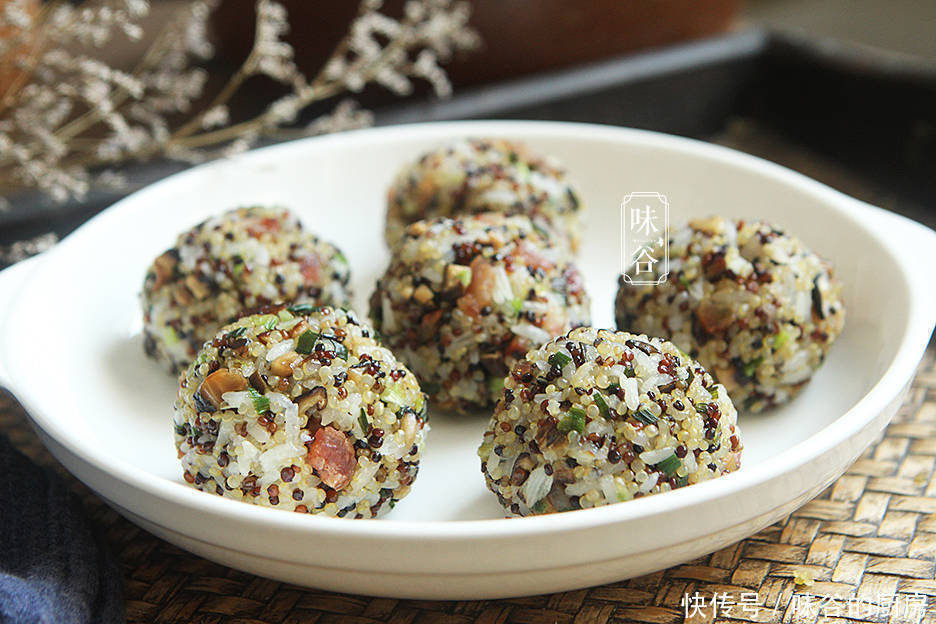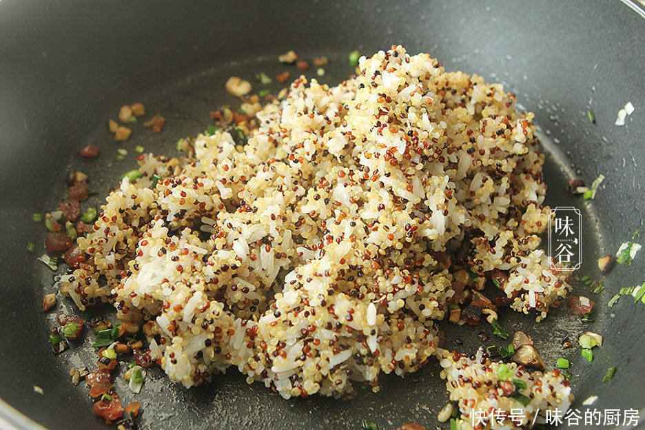 4、放入煮好的混合米饭,放入盐、少量鸡精调味,让米类吸收一下味道后即可关火。待不烫手后用保鲜膜搓成圆形,或者扭成自己喜欢的各种形状。